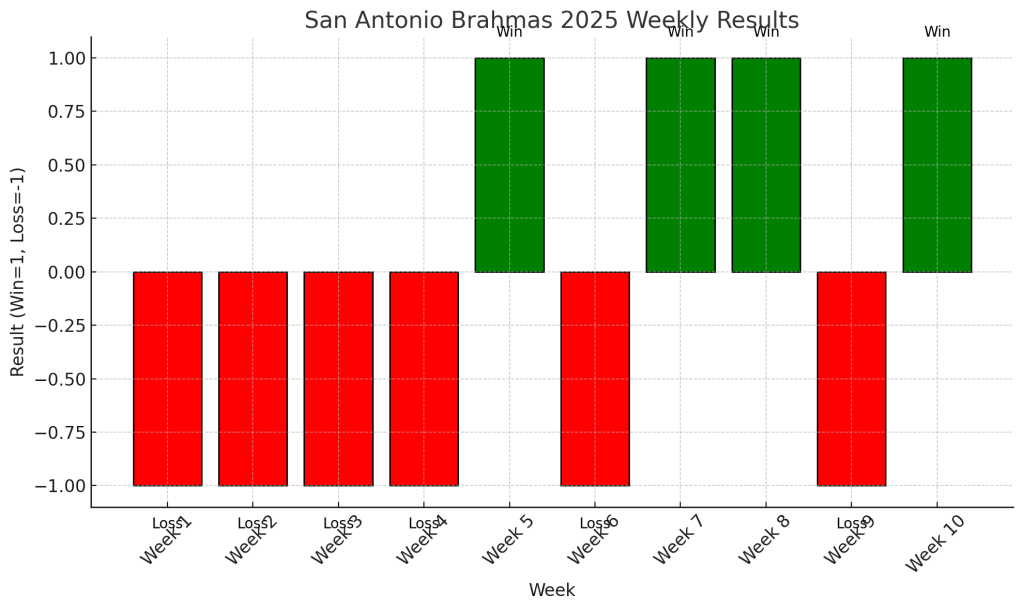 The San Antonio Brahmas enter 2025 with high expectations but face a tough schedule filled with road challenges and elite opponents. A 4-6 record shows room for improvement, especially on offense and in road environments. If they can strengthen their execution and consistency, the Brahmas could become a dark horse contender in the 2026 season.